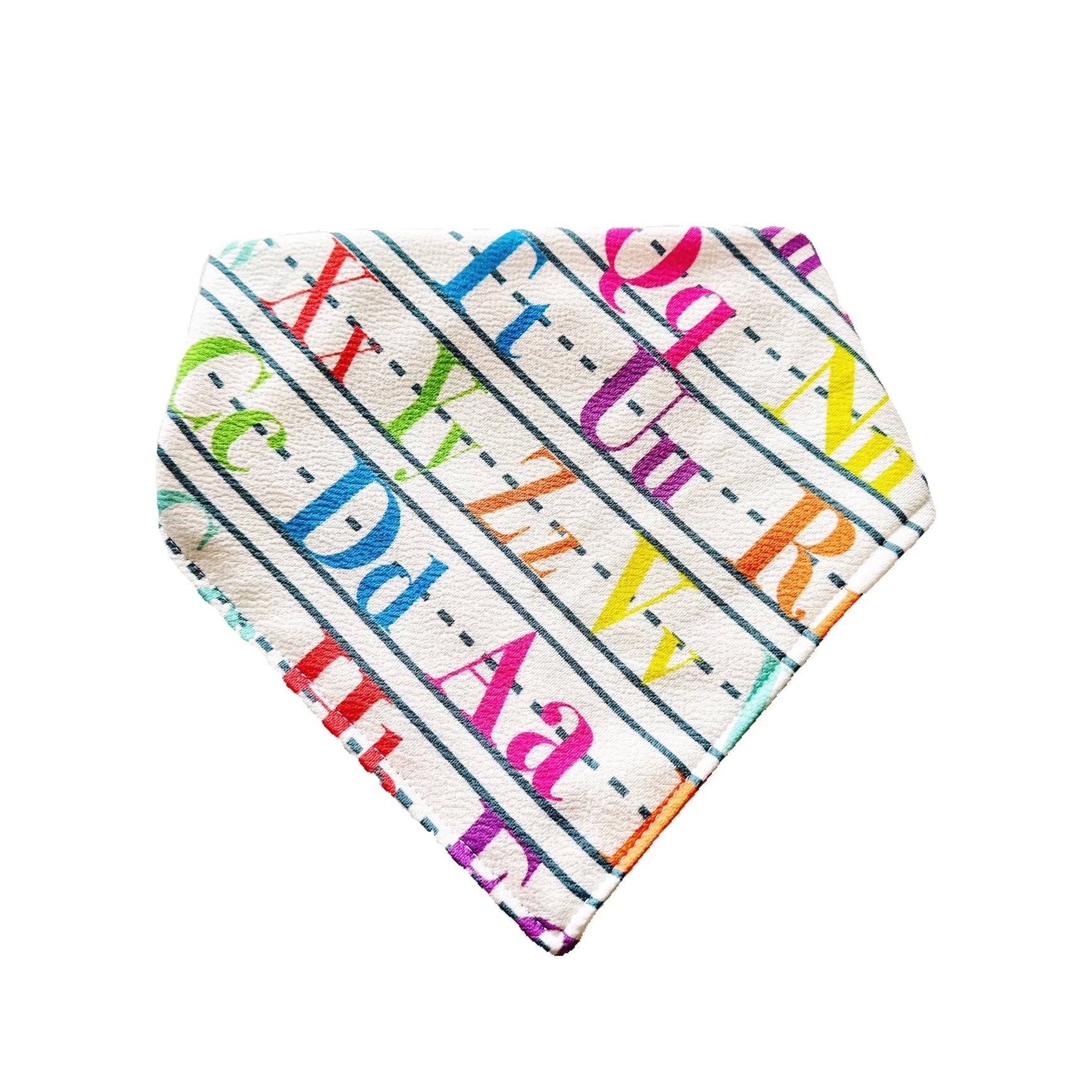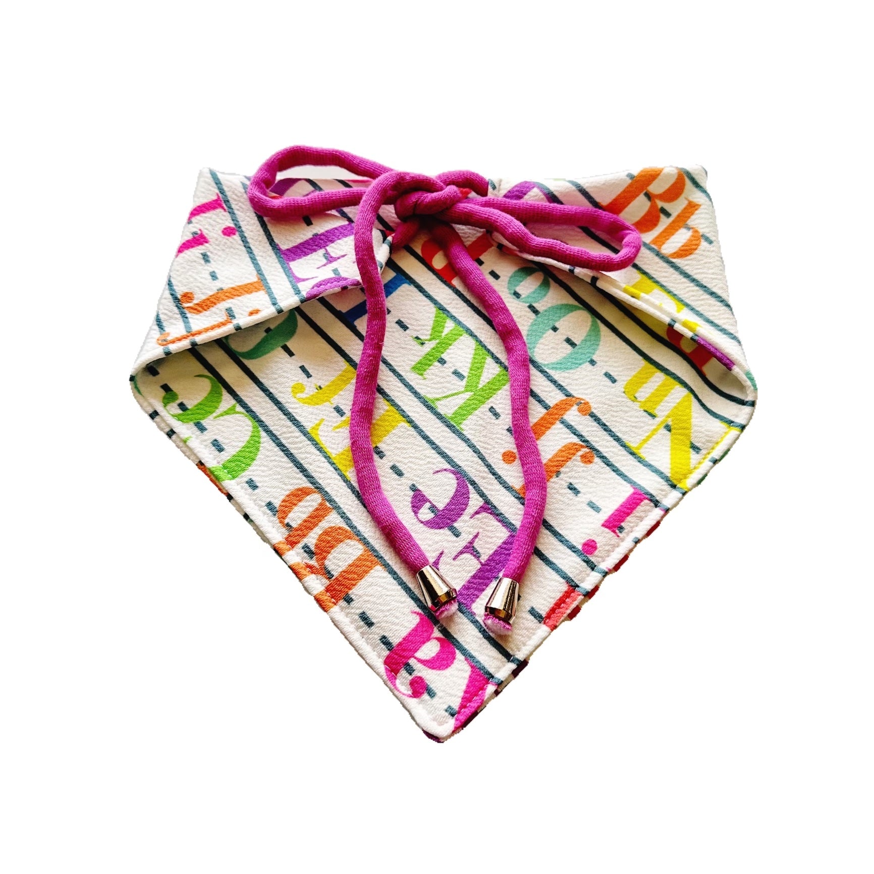 Classic school alphabet print bandana on a high quality fabric sewn together with white thread. Available with bling or plain. Matching purple ties and silver stoppers complete the back of this bandana.