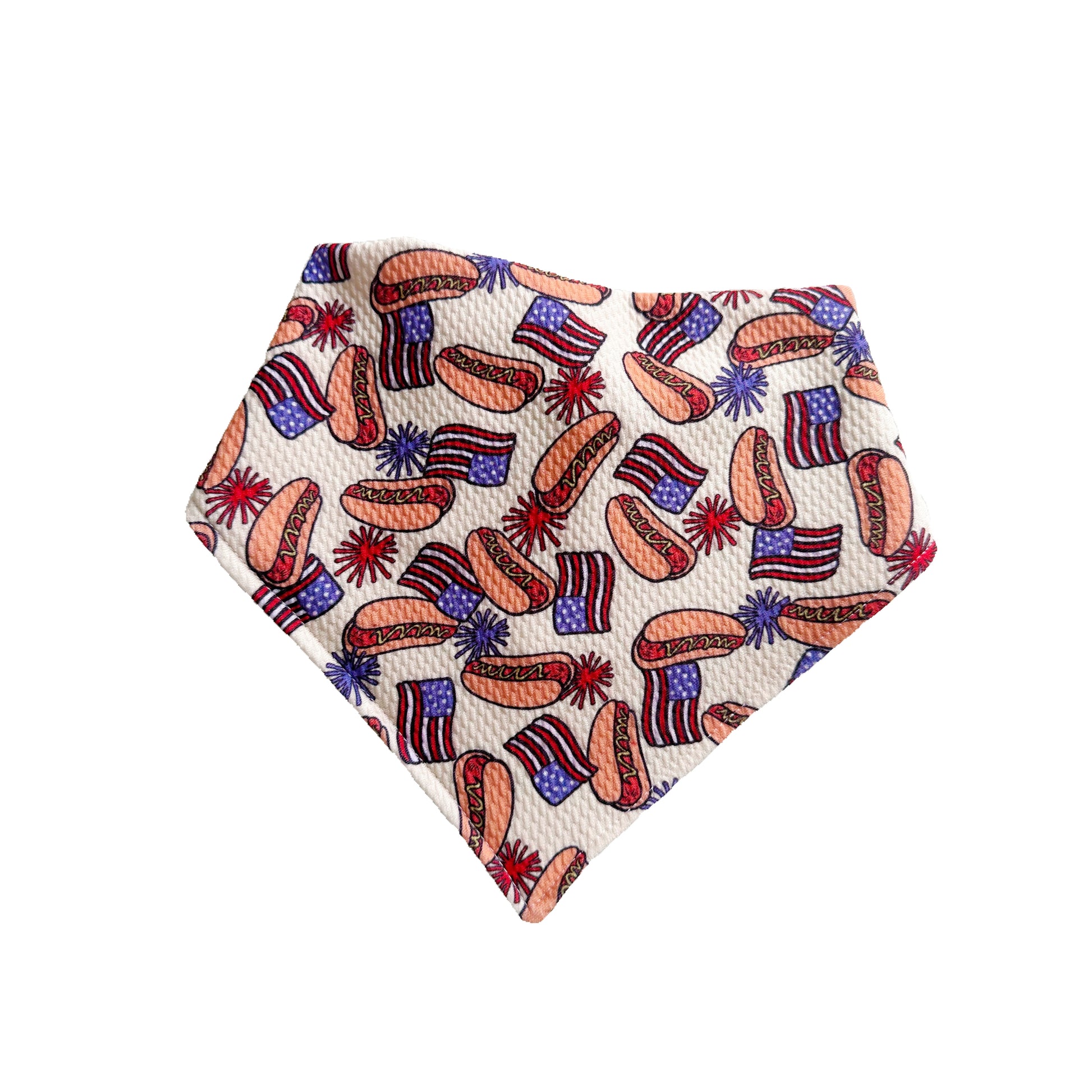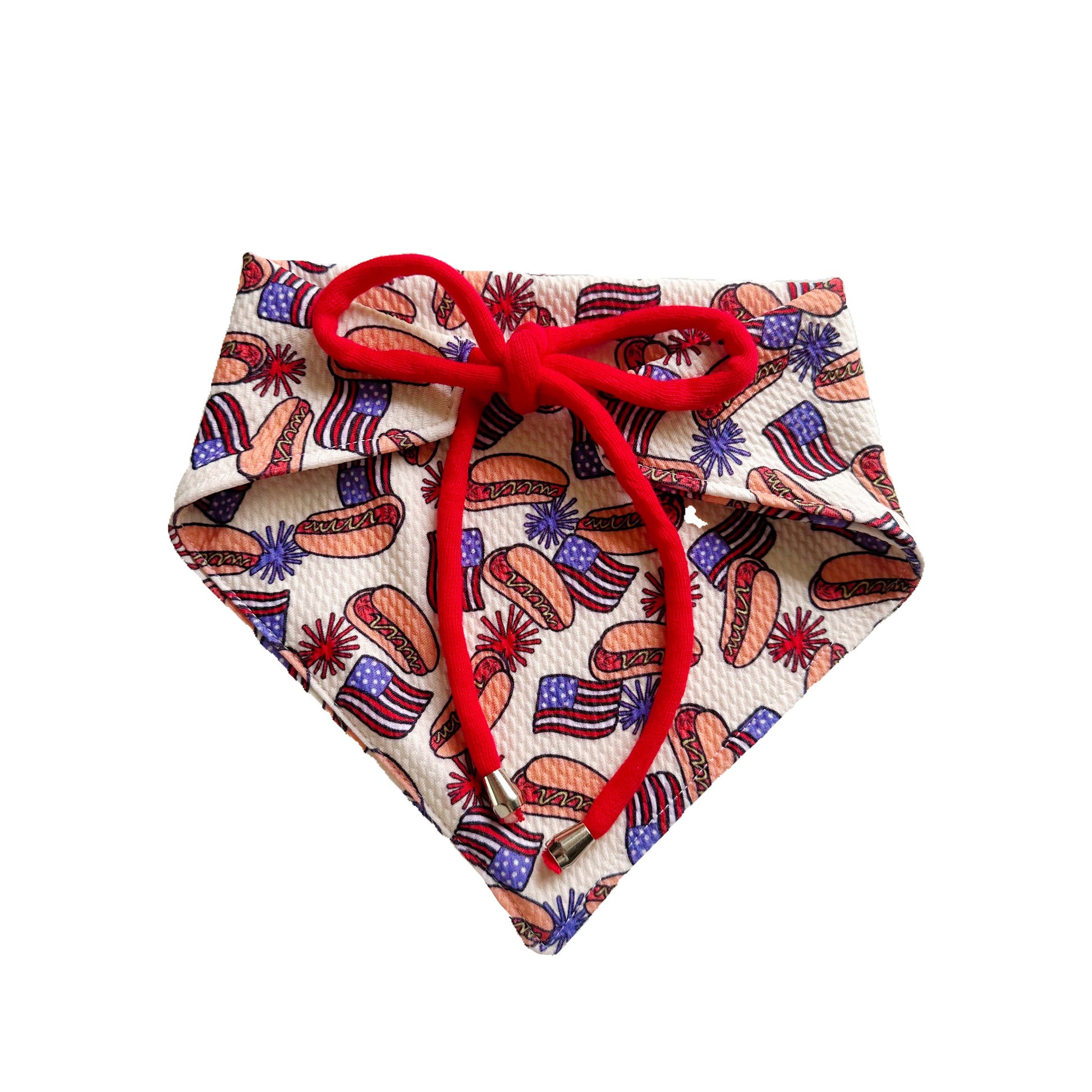 Patriotic hotdog printed bandana on a high quality fabric sewn together with white thread. Matching red ties and silver stoppers complete the back of this bandana.