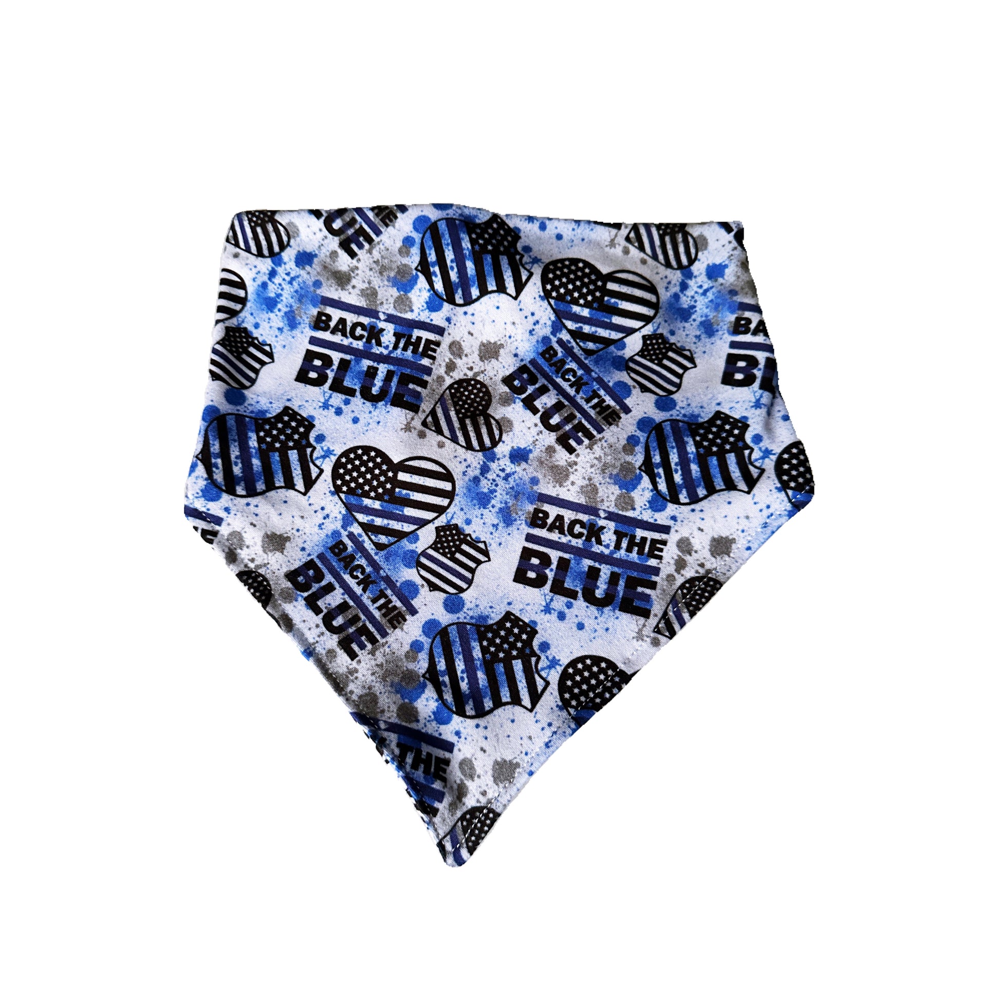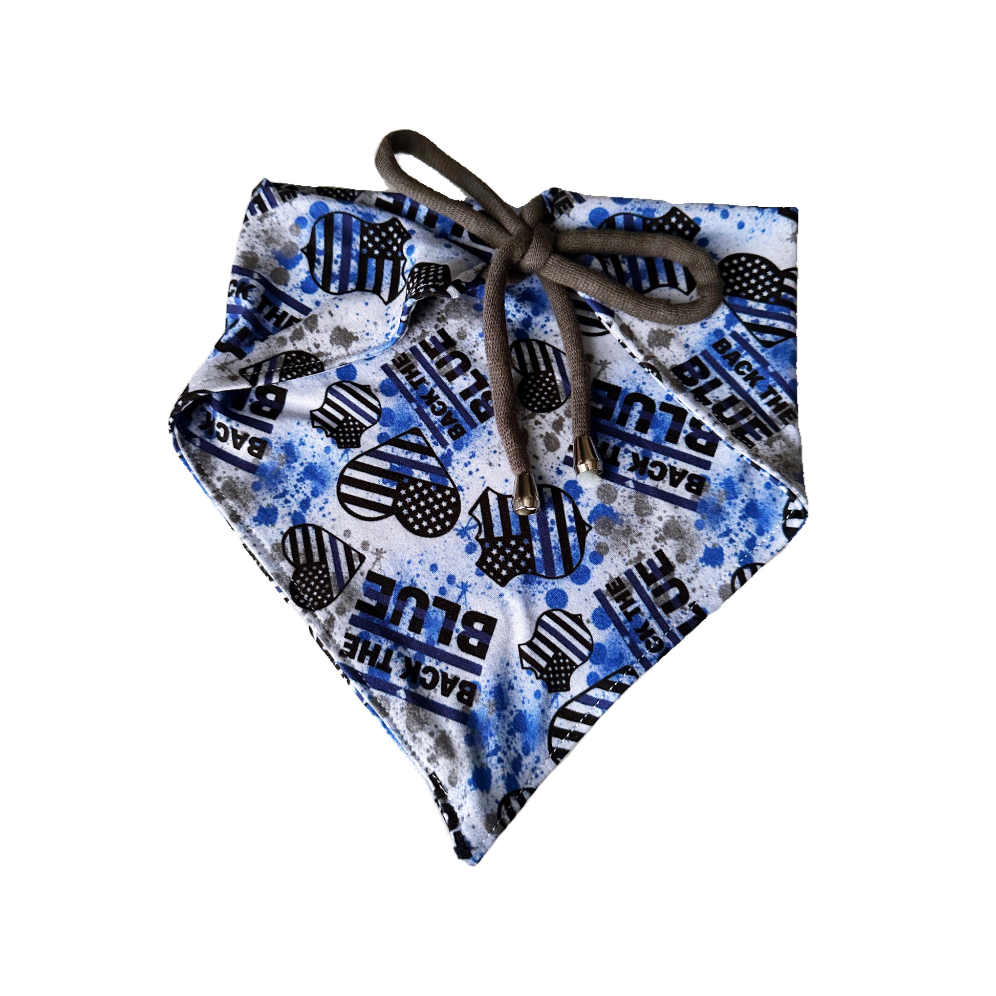 Thin Blue Line print bandana printed on a high quality fabric (very soft); sewn together with white thread. Matching ties and silver stoppers complete the back of this bandana.