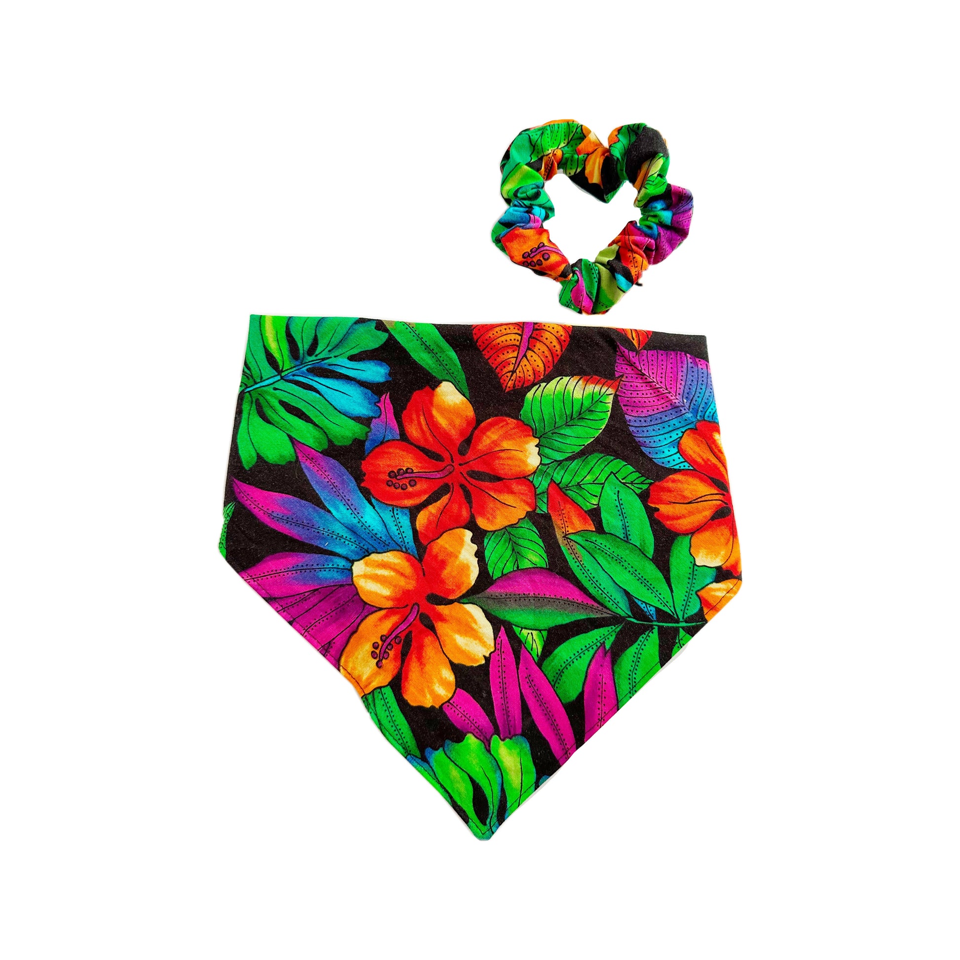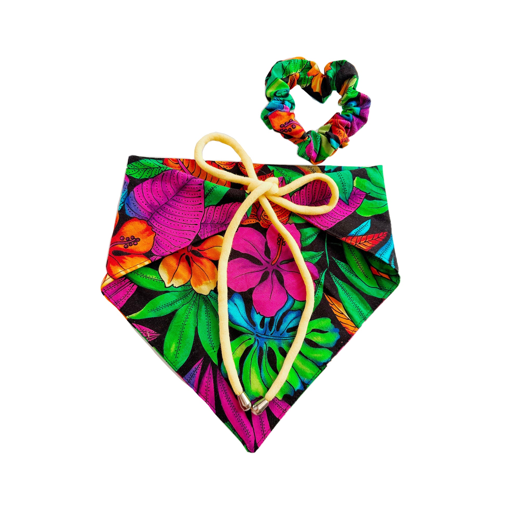 Vibrant tropical print bandana with matching scrunchie; sewn together with black thread. Matching yellow ties and silver stoppers complete the back of this bandana.