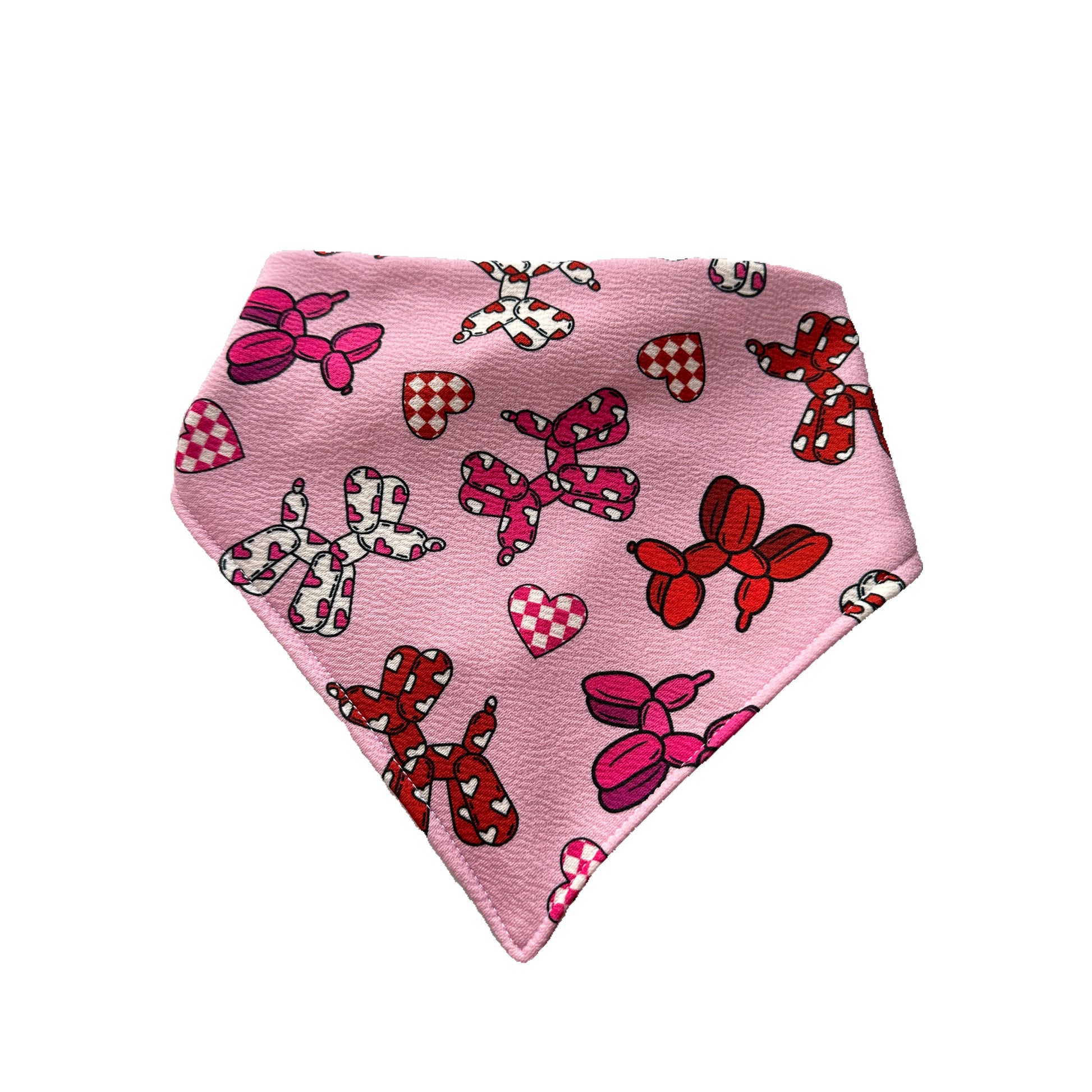 Multicolor balloon dog print bandana on a high quality fabric sewn together with white thread. Matching ties and silver stoppers complete the back of this bandana.