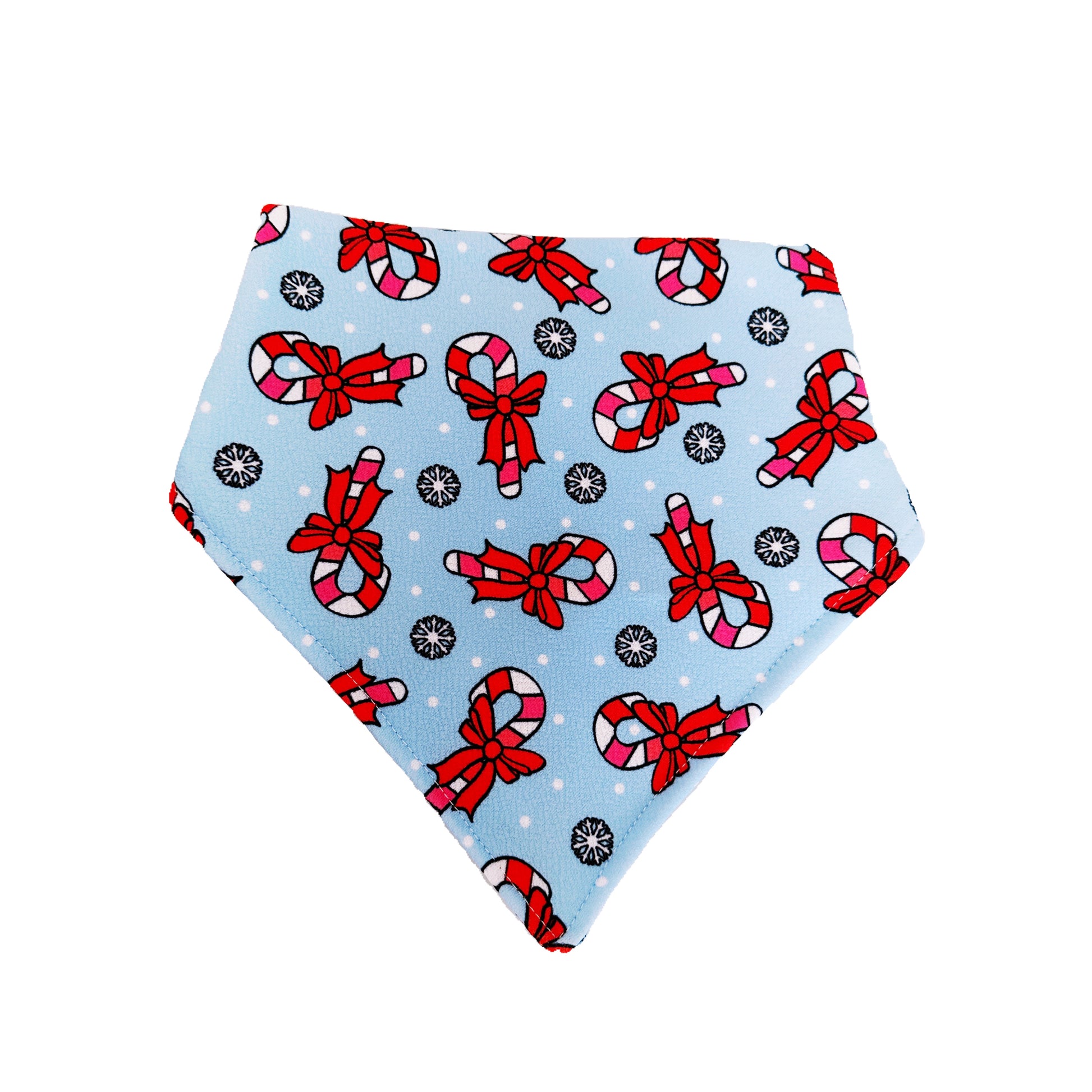 Icy Blue snowflake and candy cane print bandana on a high quality fabric sewn together with white thread. Matching ties and silver stoppers complete the back of this bandana.
