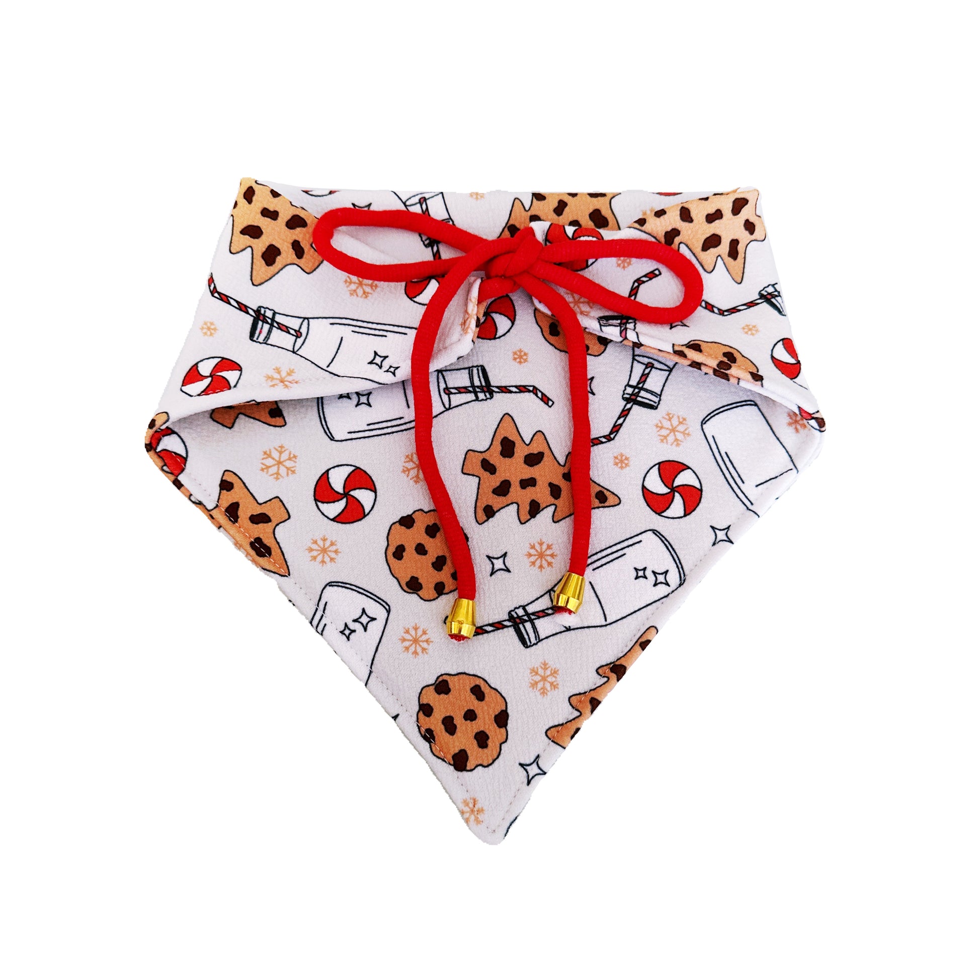 Fun Chocolate Chip Christmas Tree Cookie print bandana on a high quality fabric sewn together with white thread. Matching ties and silver stoppers complete the back of this bandana.