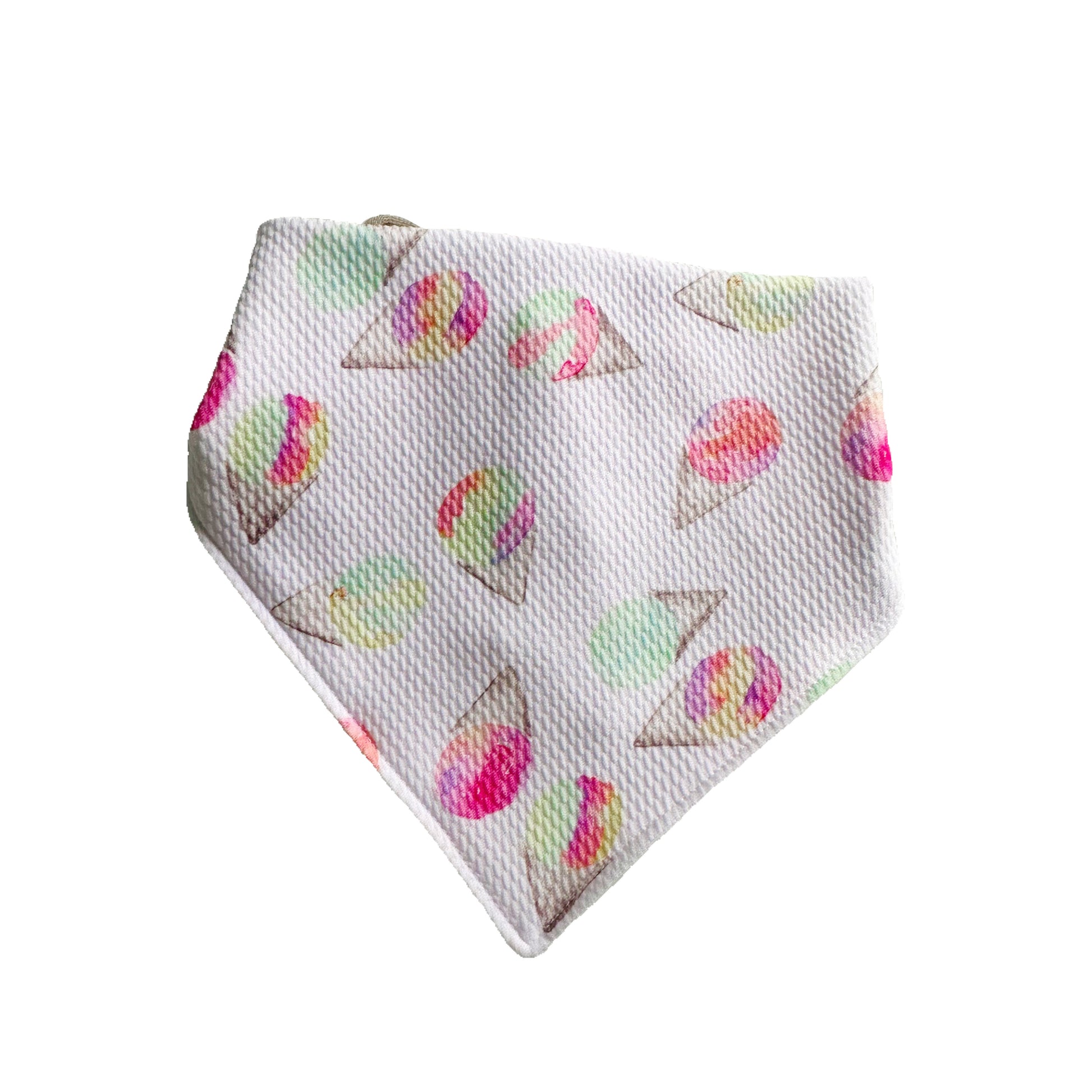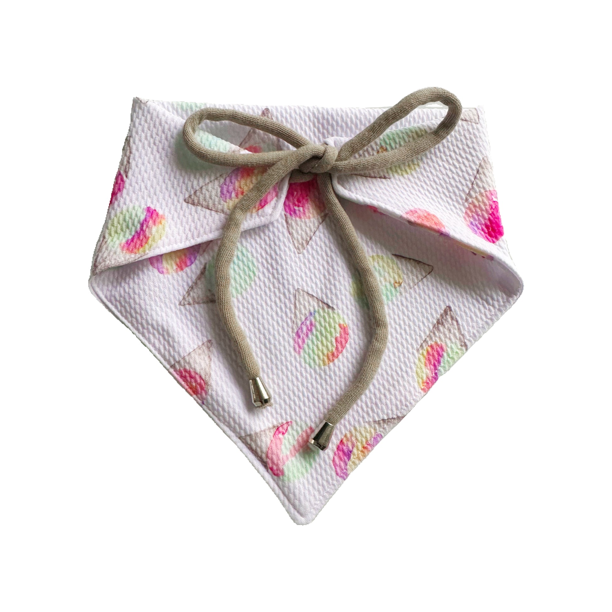 Watercolor snow cones printed on a high quality white fabric sewn together with white thread. Matching light grey ties and silver stoppers complete the back of this bandana.