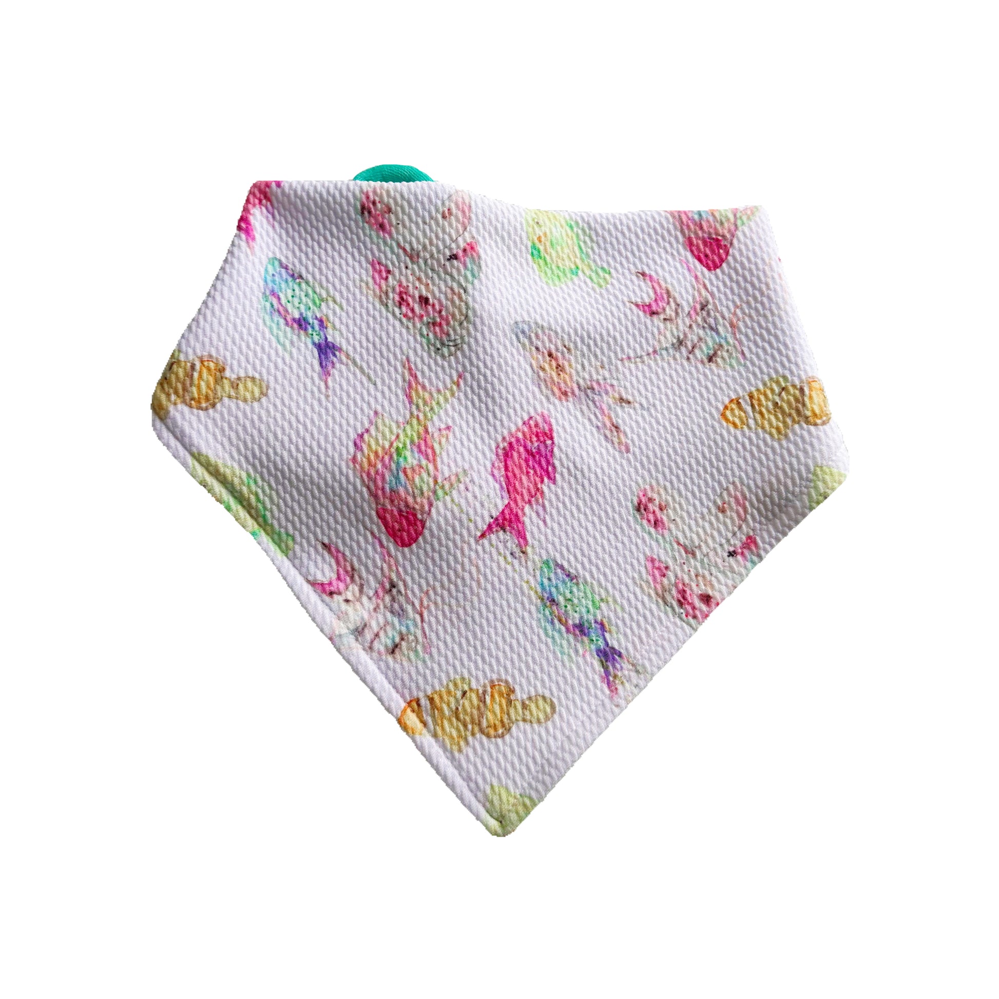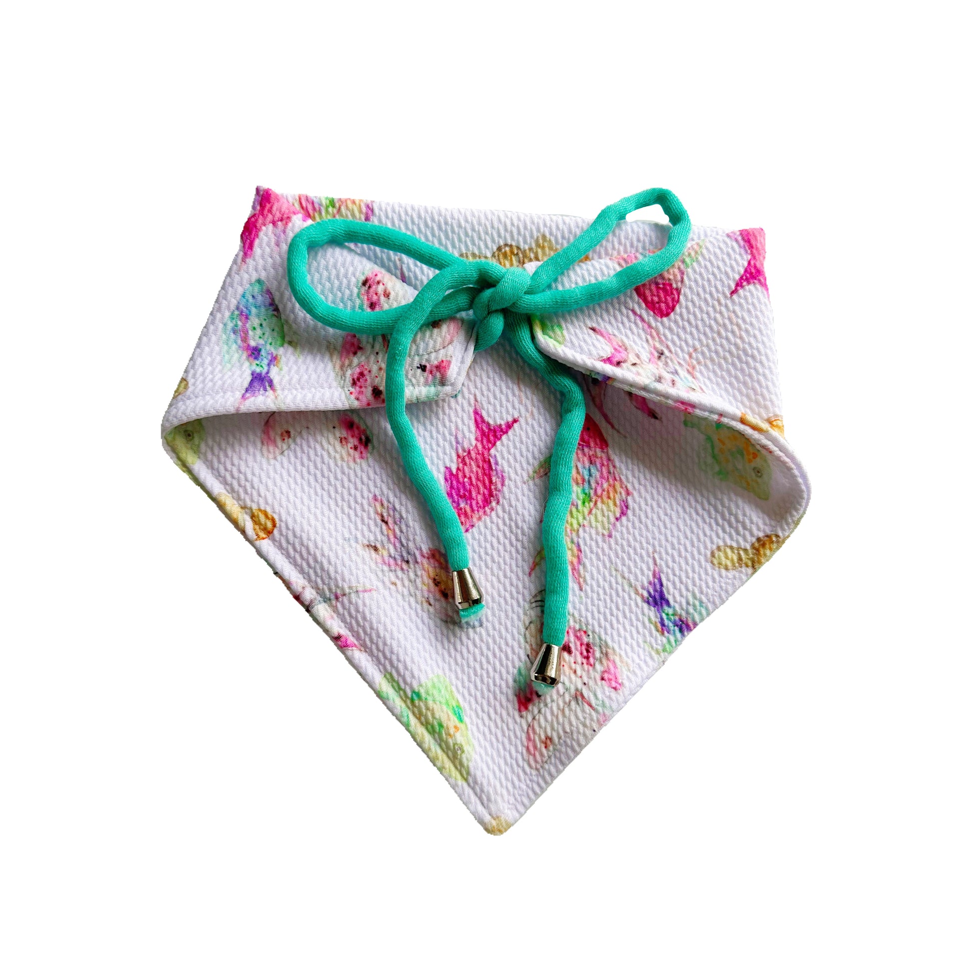 Watercolor fish printed on a high quality white fabric sewn together with white thread. Matching turquoise ties and silver stoppers complete the back of this bandana.