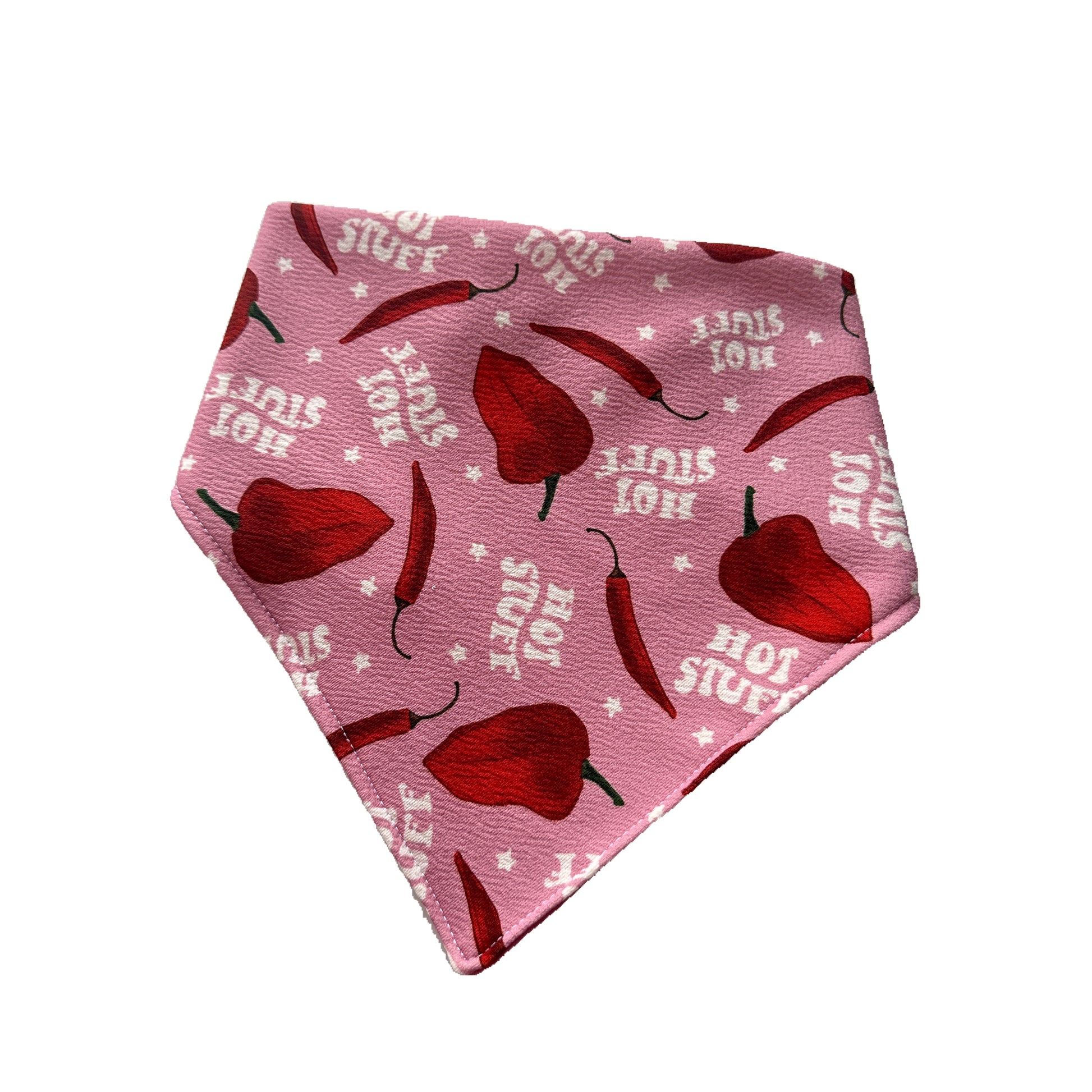 Red Pepper print bandana on a high quality fabric sewn together with white thread. Matching ties and silver stoppers complete the back of this bandana.