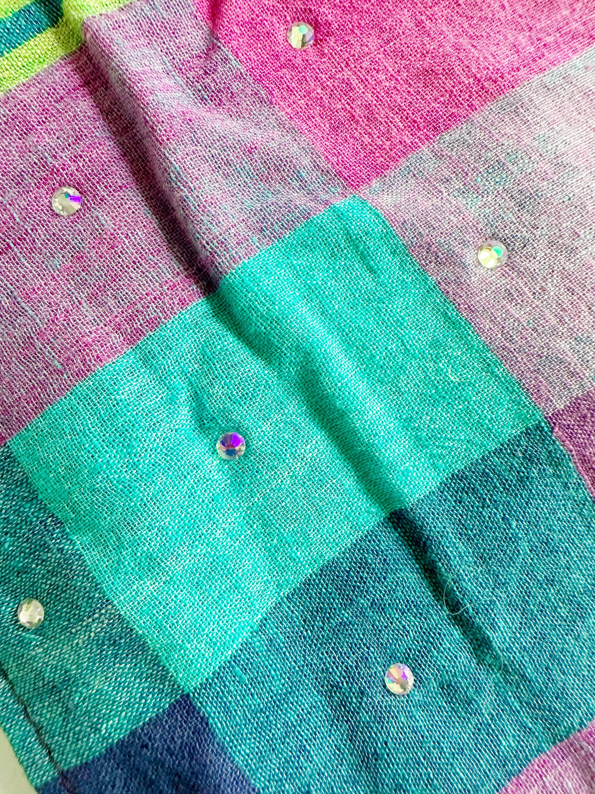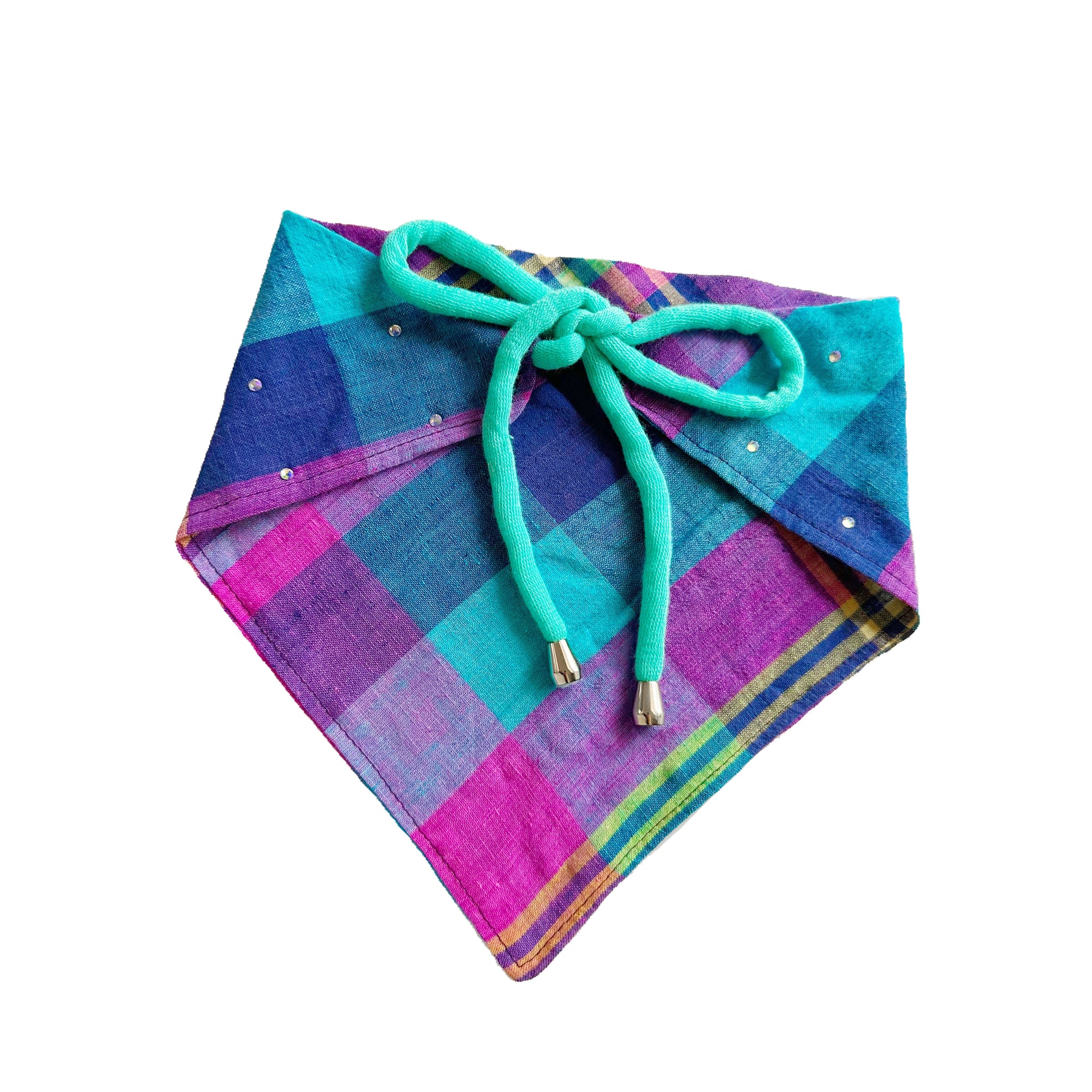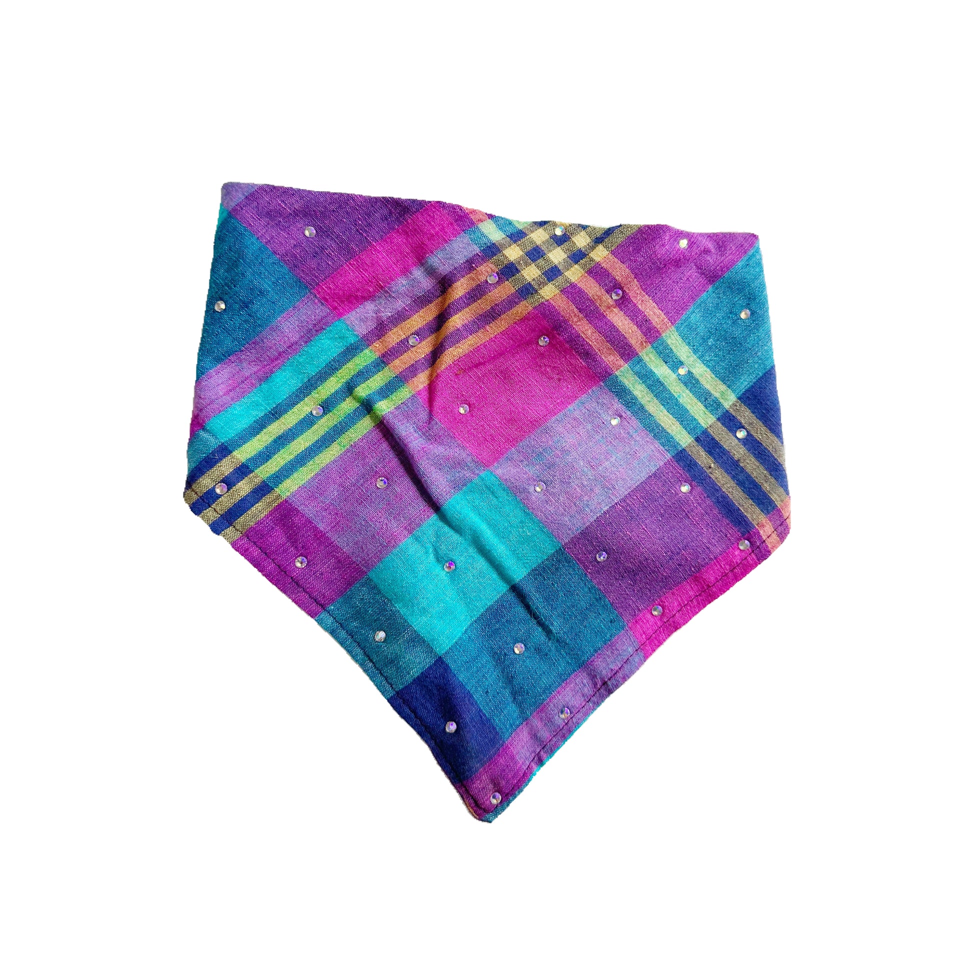 Blue and purple plaid bandana sewn together with dark purple thread. Coordinating rhinestones scattered throughout the bandana. Matching turquoise ties and silver stoppers complete the back of this bandana.
