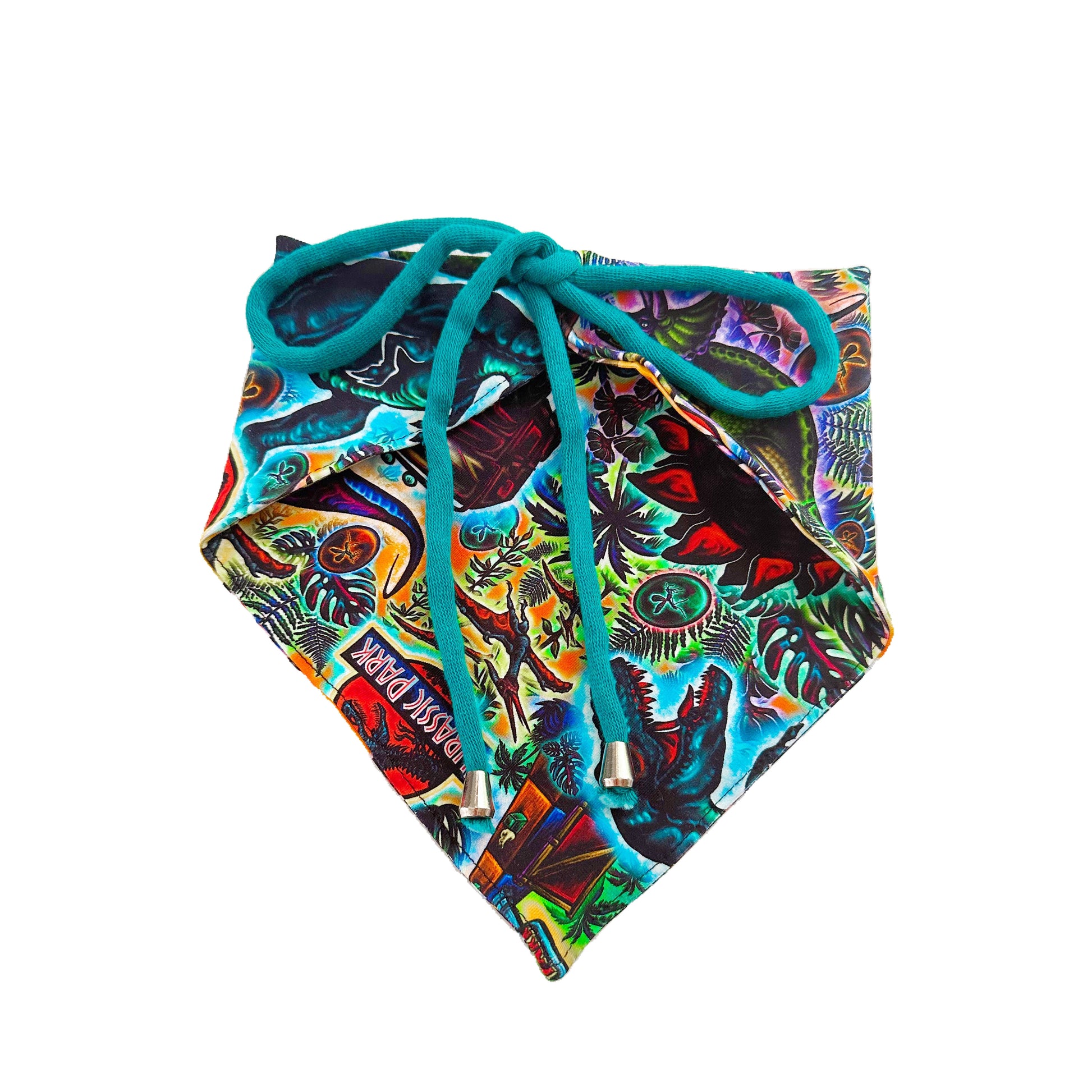 Colorful dinosaur print bandana (high quality fabric) sewn together with black thread. Matching deep teal ties and silver stoppers complete the back of this bandana.