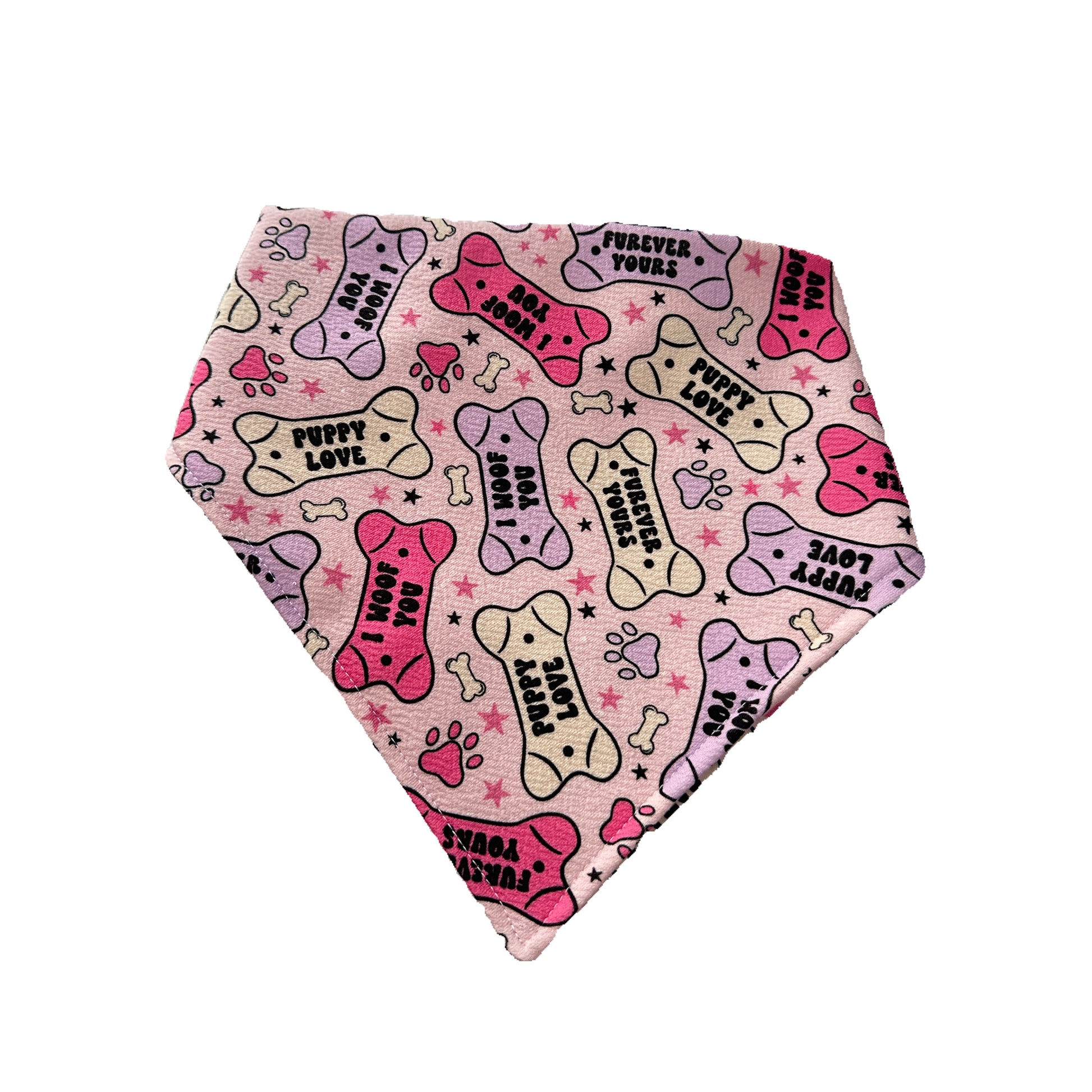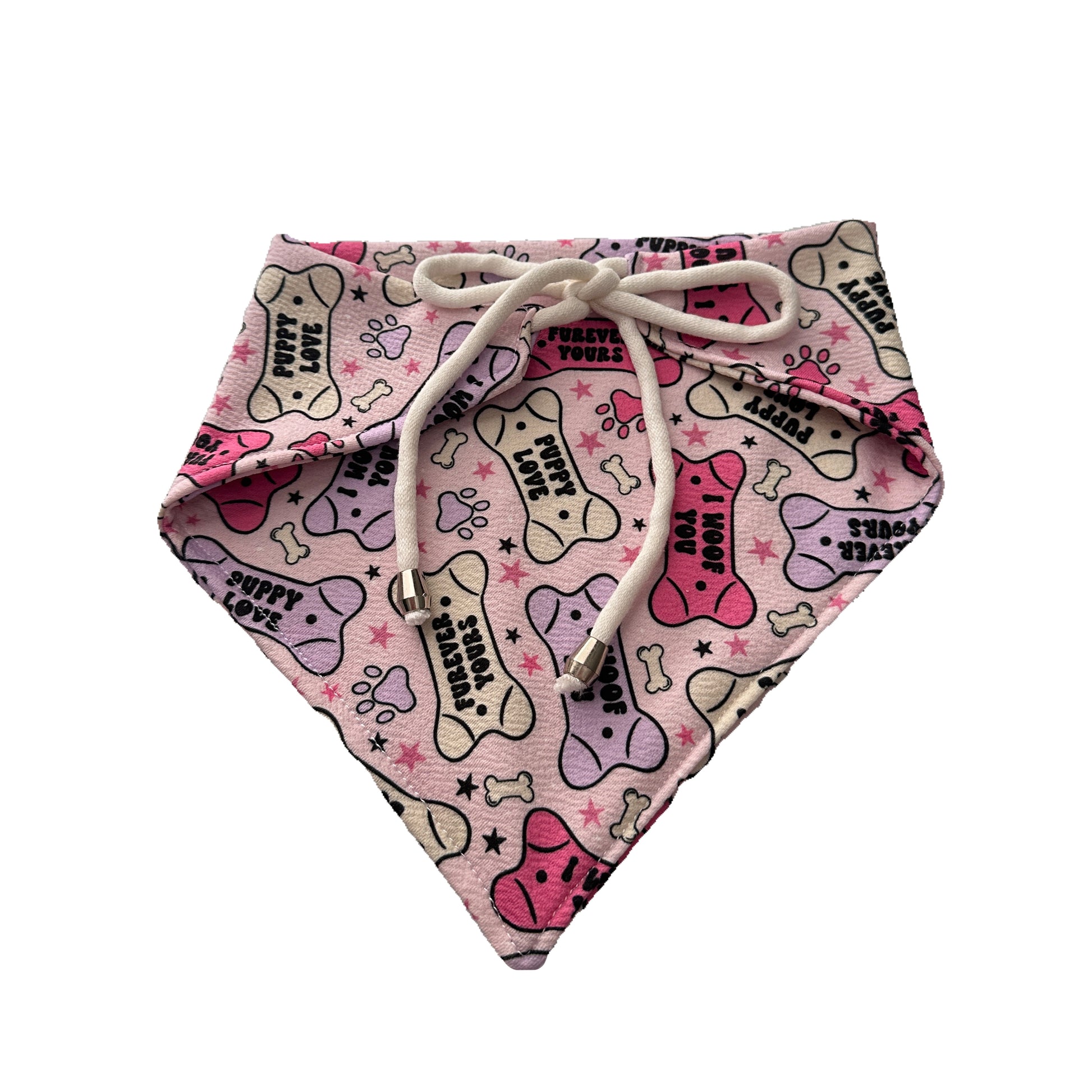 V-Day dog bone print bandana on a high quality fabric sewn together with white thread. Matching ties and silver stoppers complete the back of this bandana.