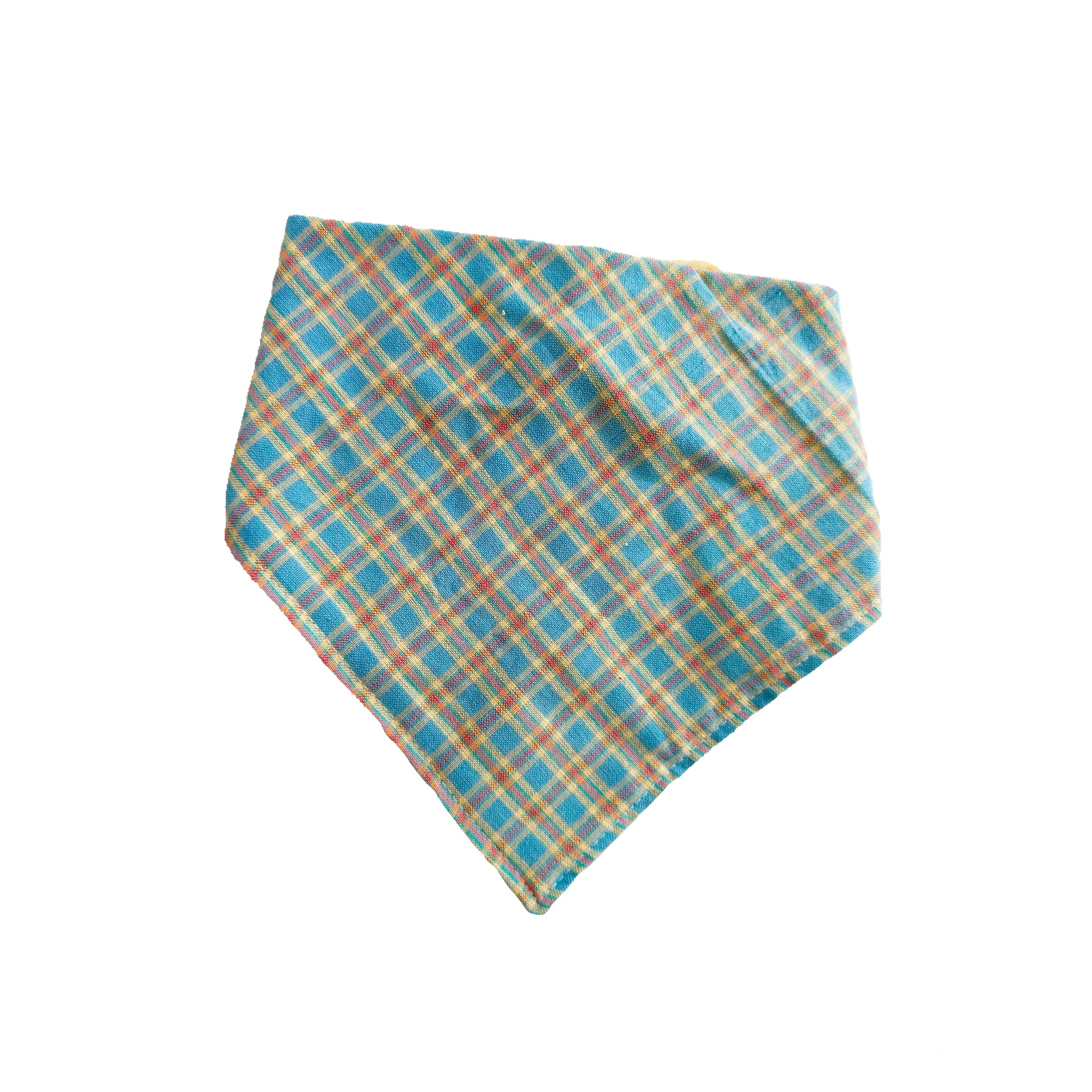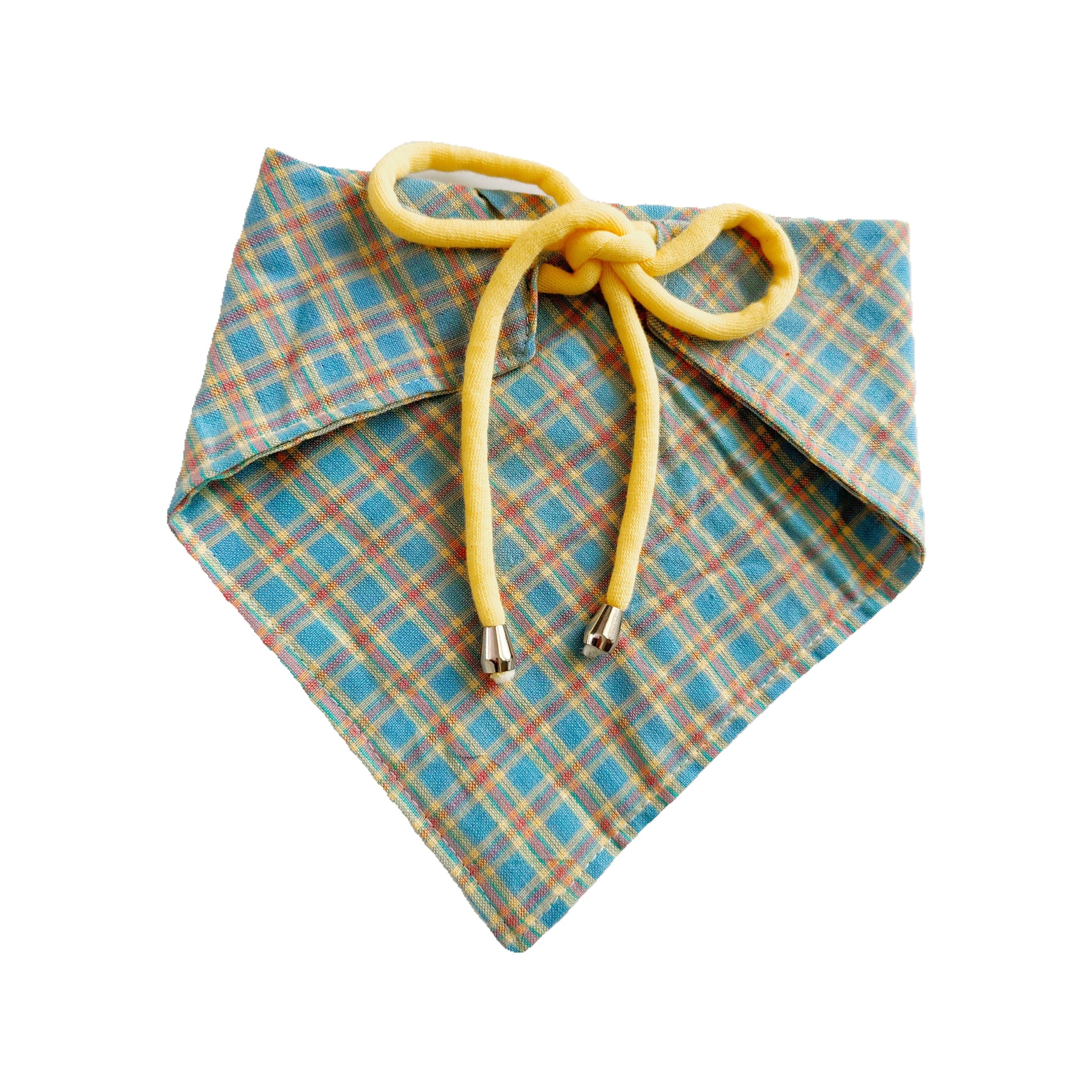 Blue, yellow, and orange bandana sewn together with white thread. Matching yellow ties and silver stoppers complete the back of this bandana.