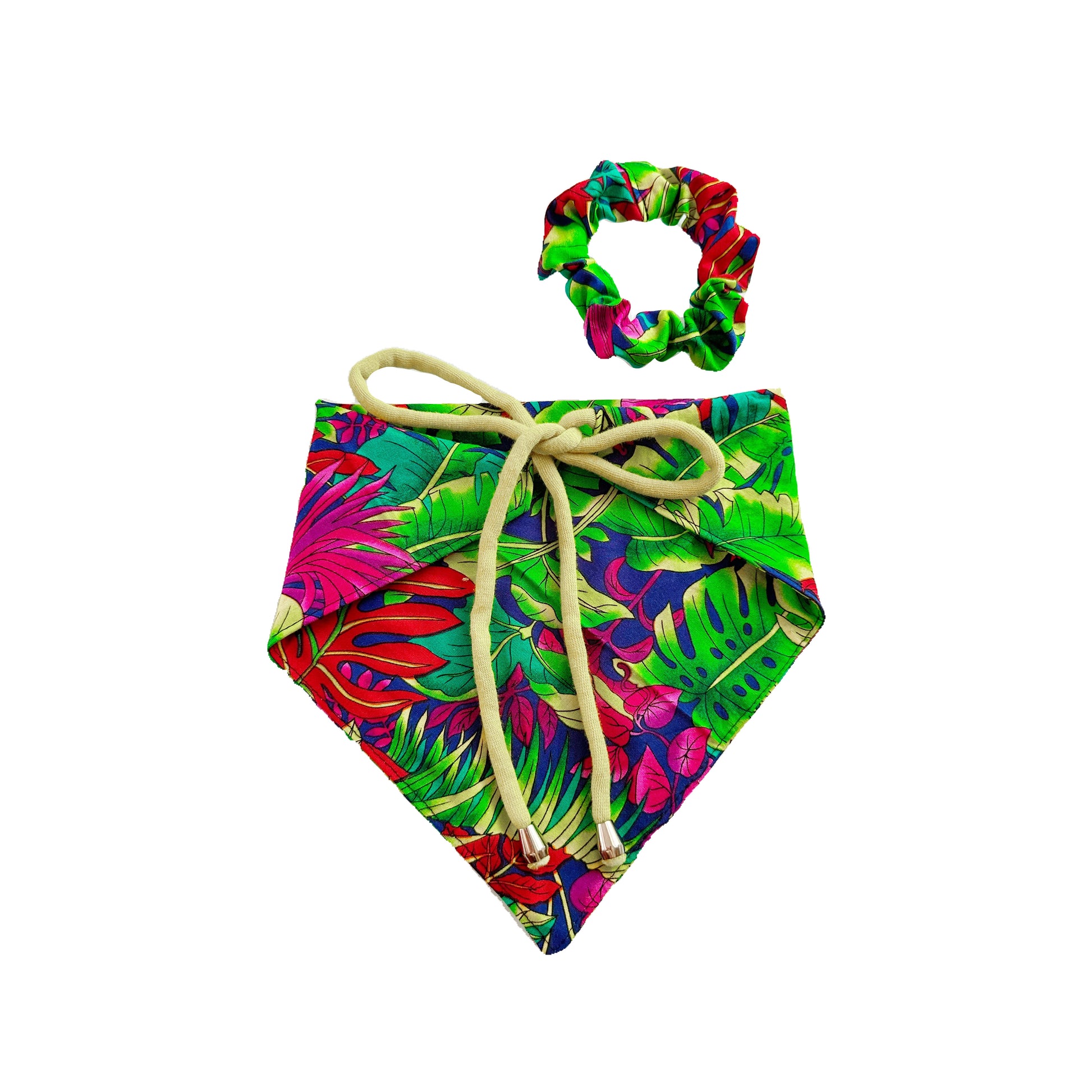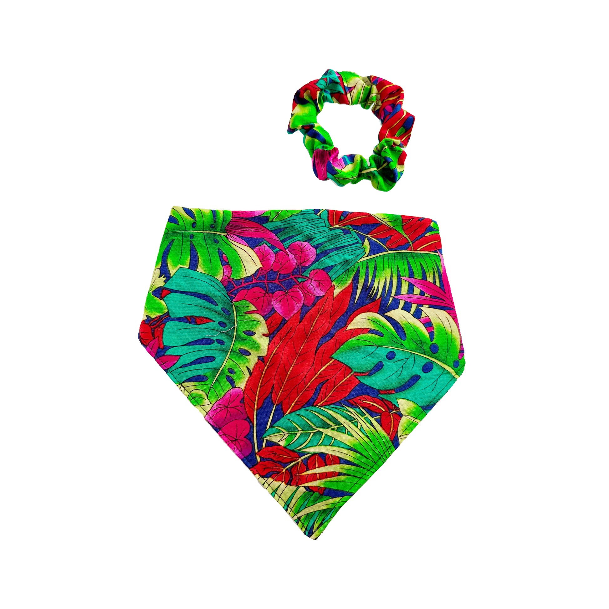 Vibrant tropical print bandana with matching scrunchie; sewn together with black thread. Matching chartreuse ties and silver stoppers complete the back of this bandana.
