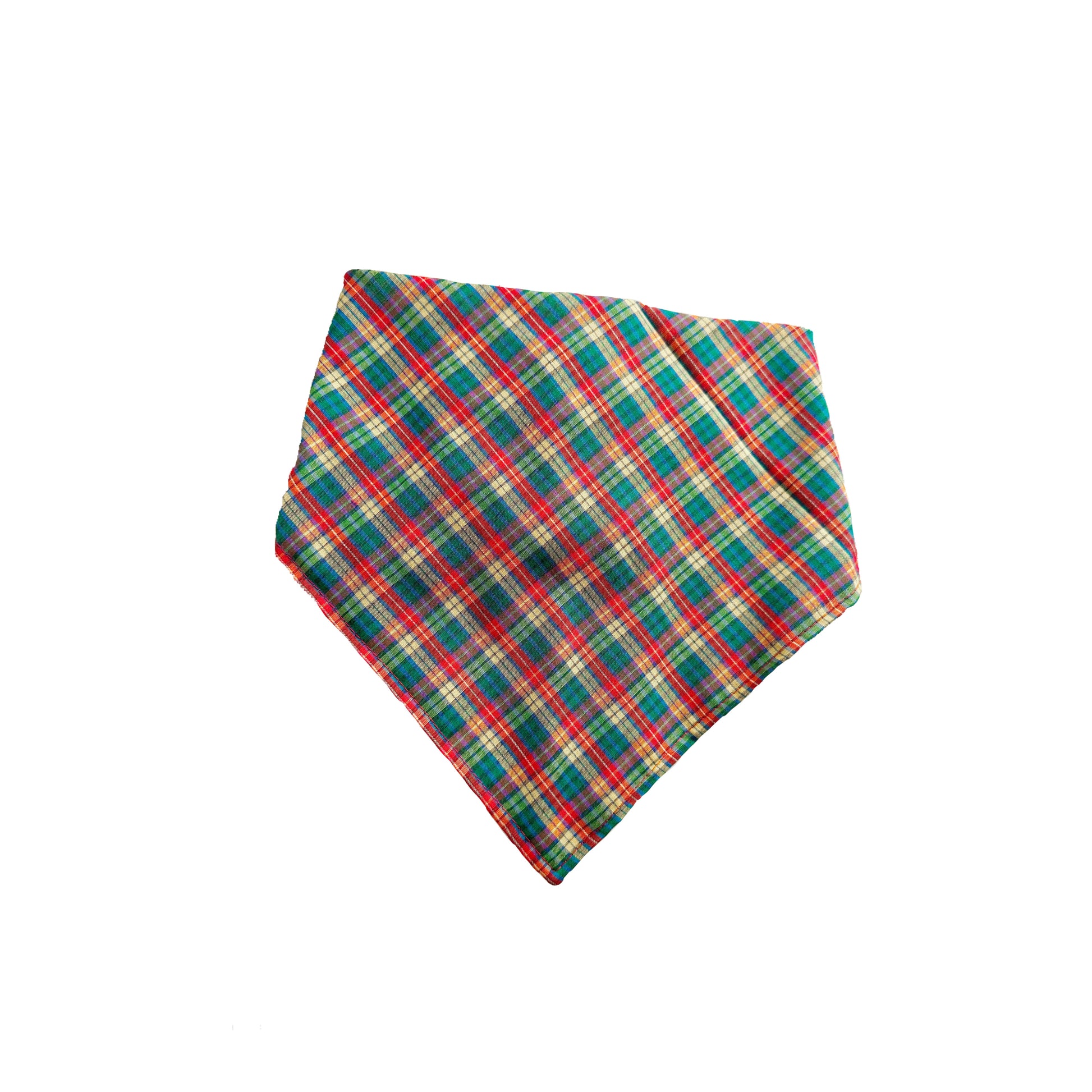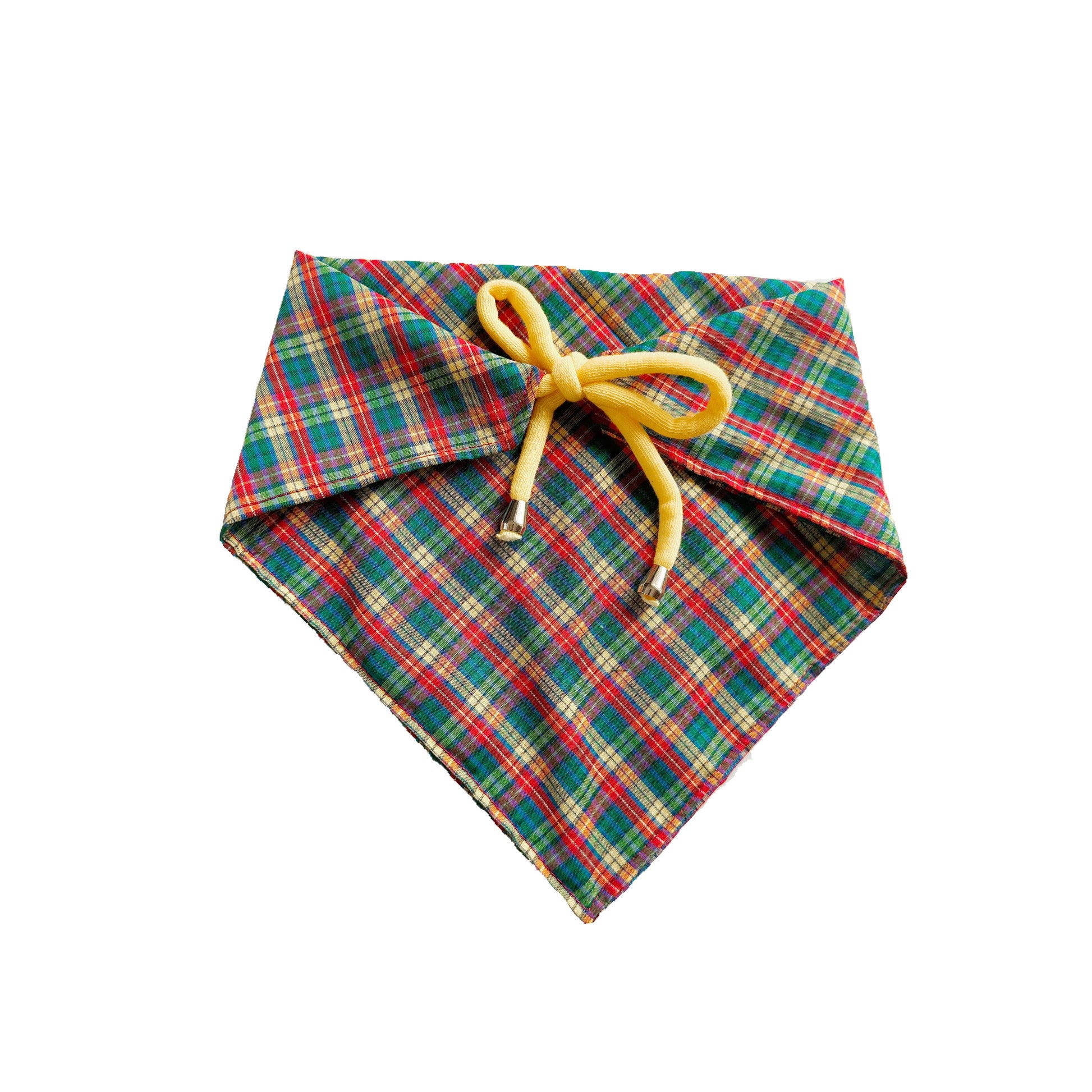 Red, green, and yellow plaid bandana sewn together with red thread. Matching yellow ties and silver stoppers complete the back of this bandana.