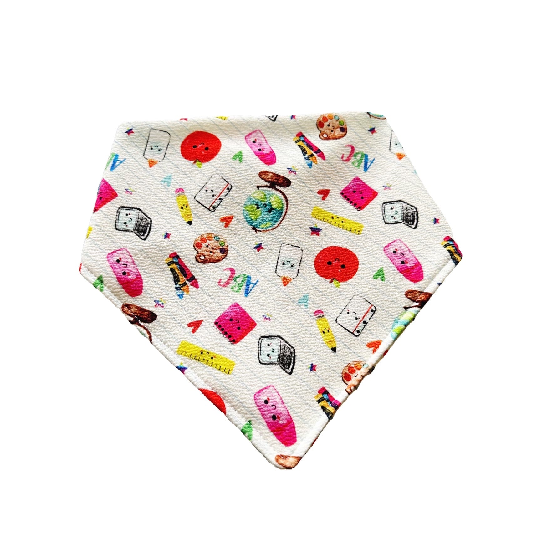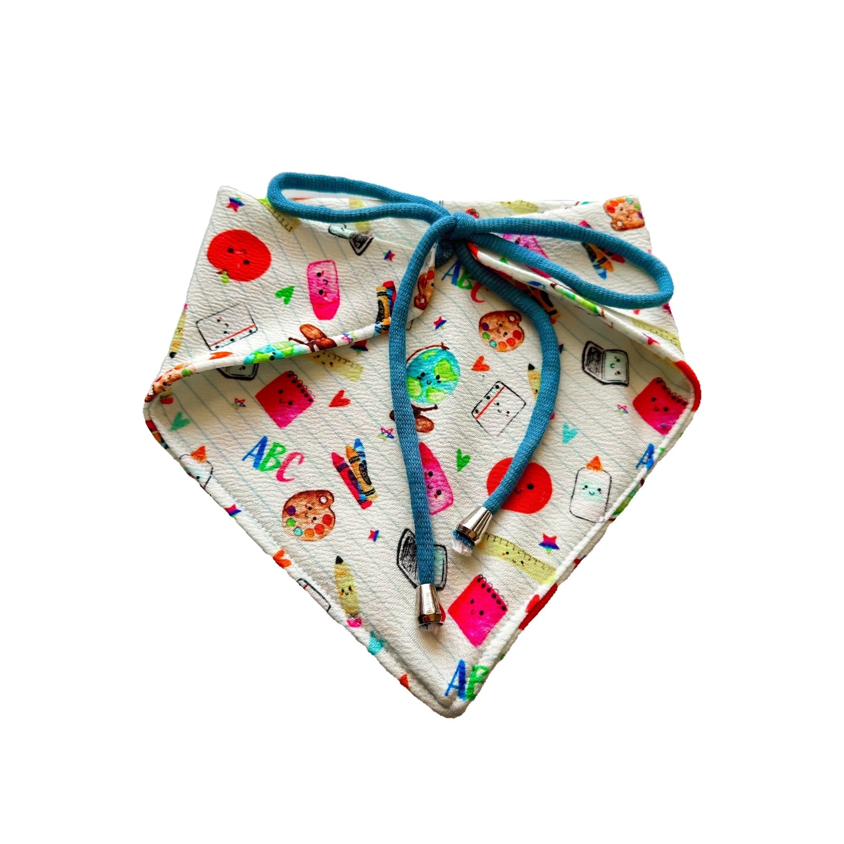Cute smiley school supplies print bandana on a high quality fabric sewn together with white thread. Available with bling or plain. Matching blue ties and silver stoppers complete the back of this bandana.