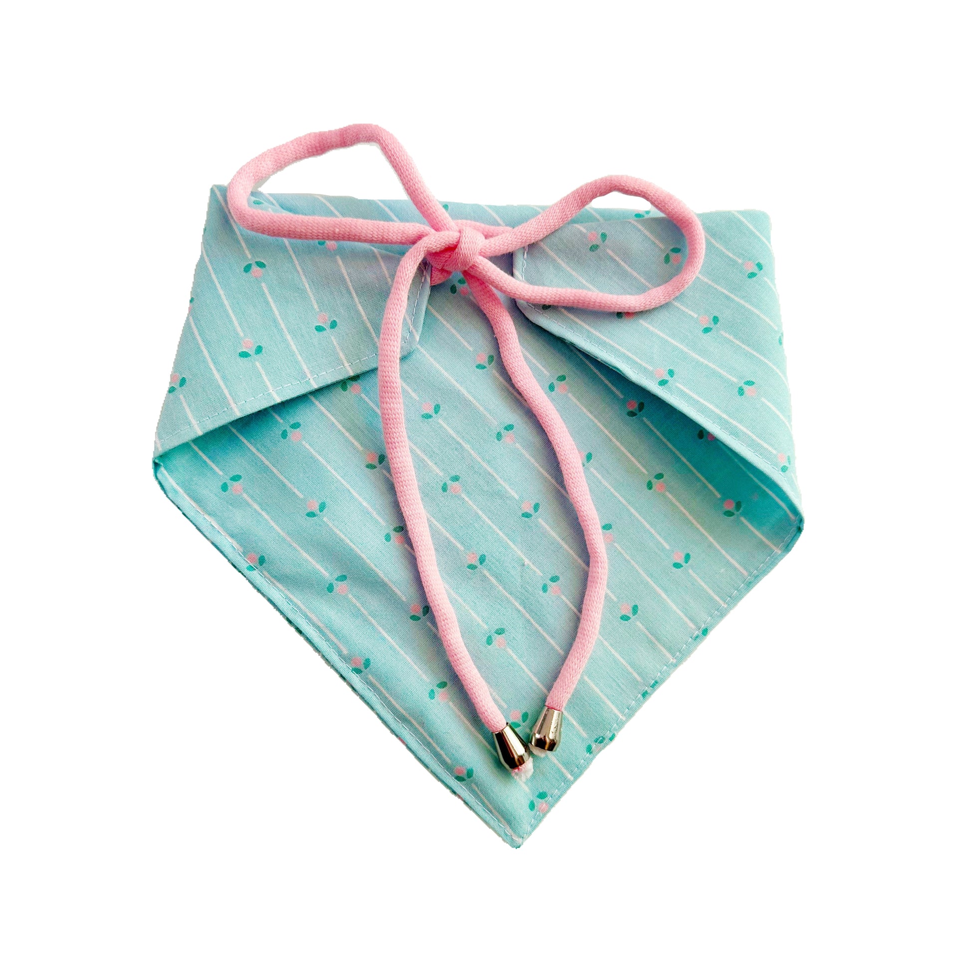 Baby Blue bandana with small printed pink rosettes; sewn together with white thread. Matching pink ties and silver stoppers complete the back of this bandana.