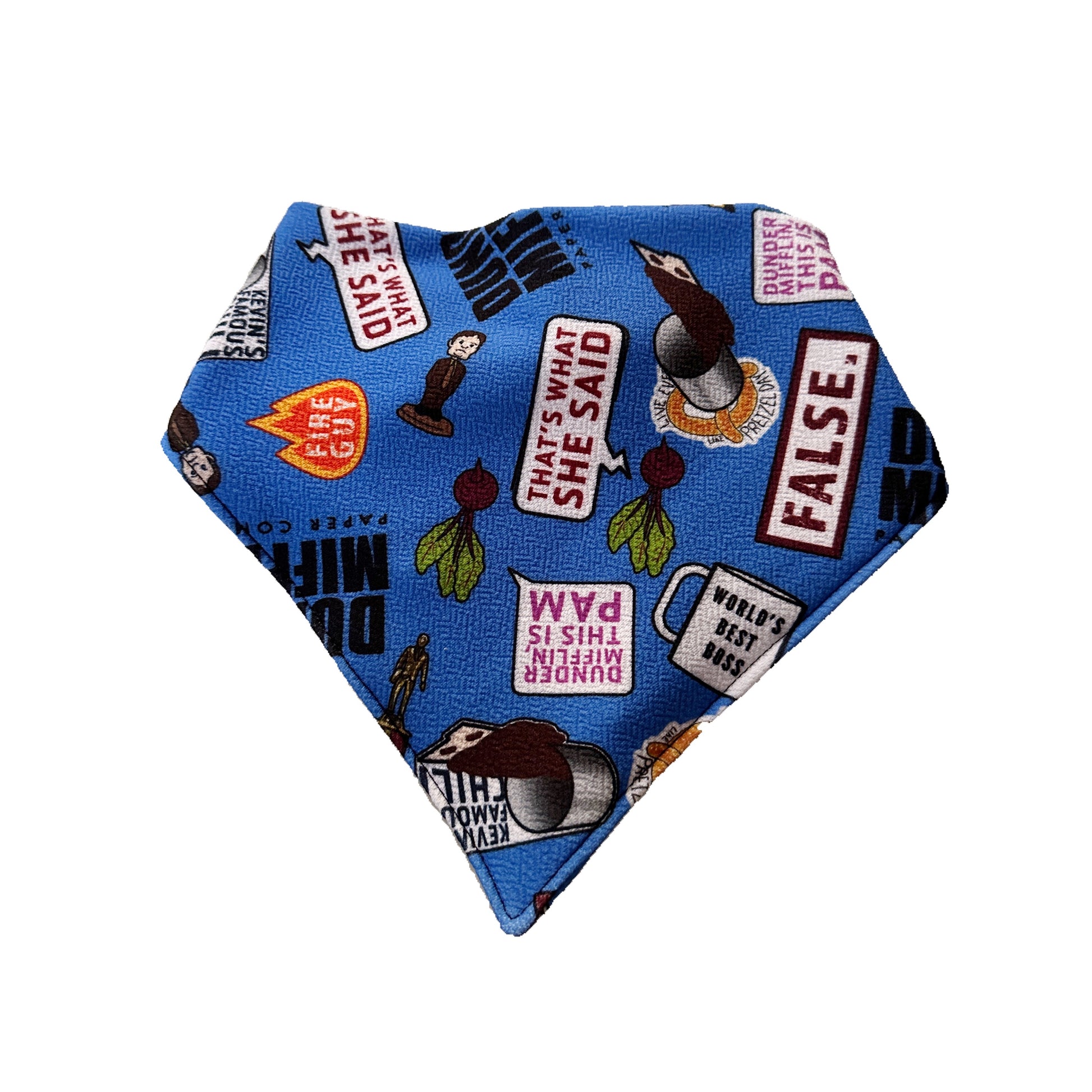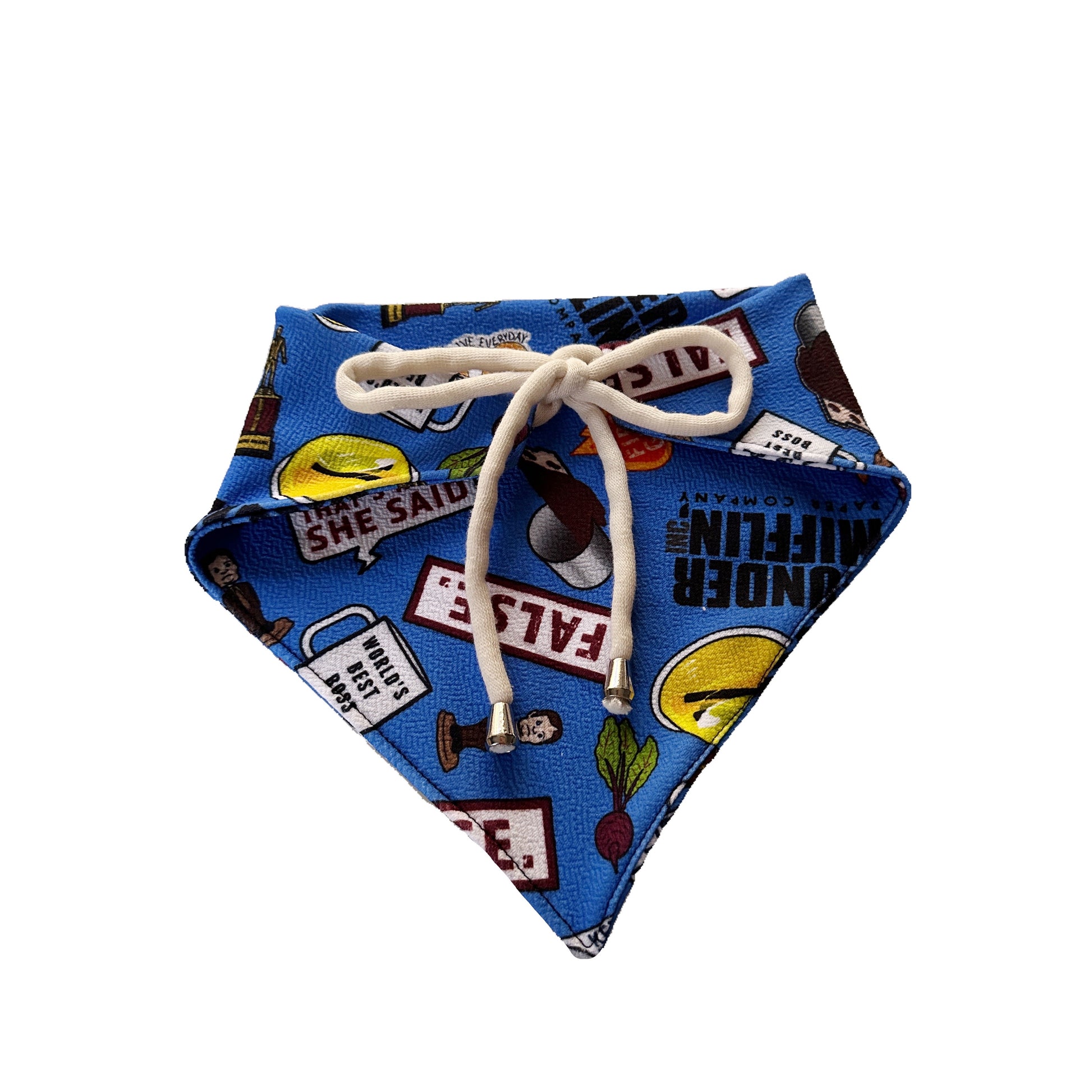 TV show inspired bandana on a high quality fabric sewn together with black thread. Matching white ties and silver stoppers complete the back of this bandana.