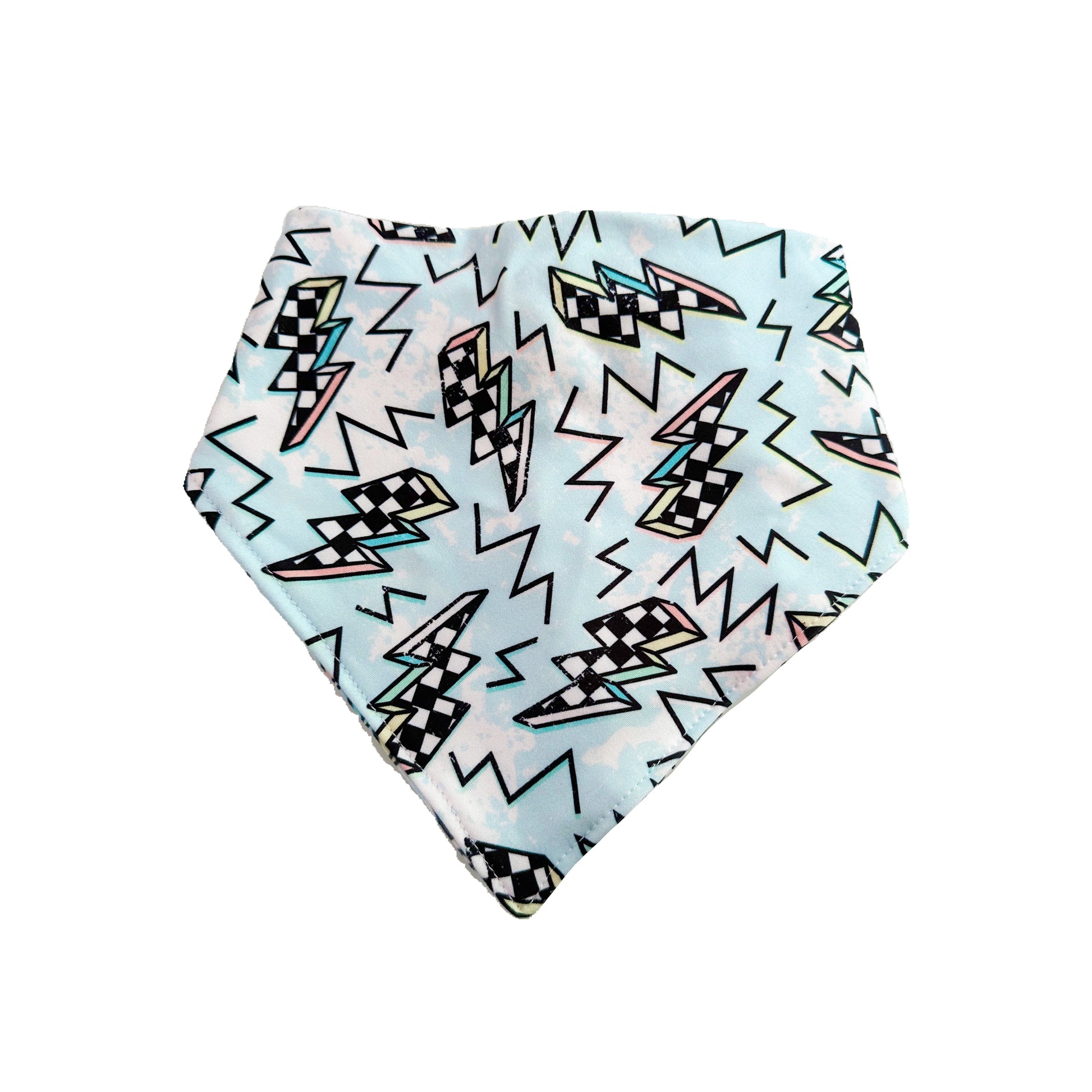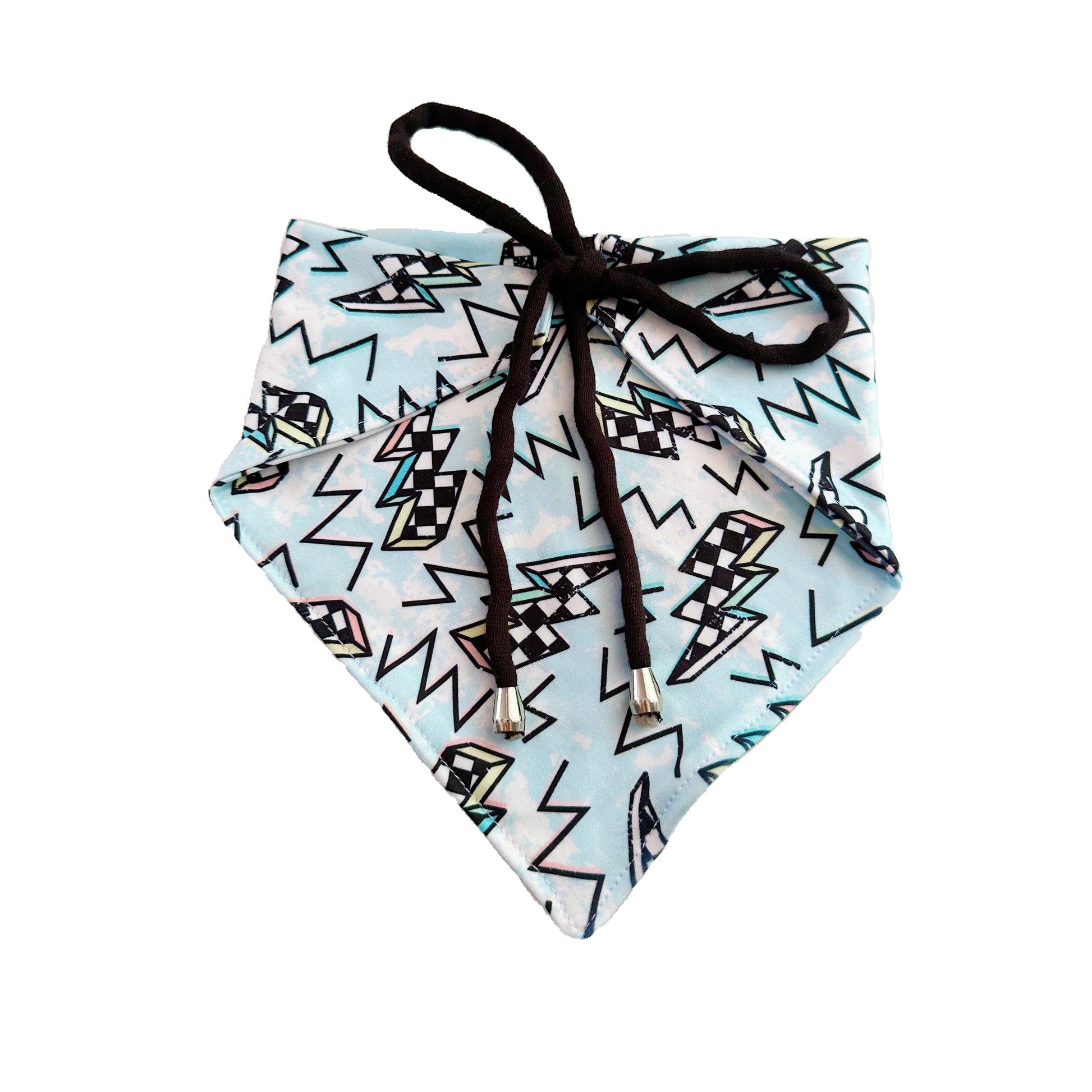 Retro check lightning bolt bandana printed on a high quality fabric (very soft); sewn together with white thread. Matching black ties and silver stoppers complete the back of this bandana.